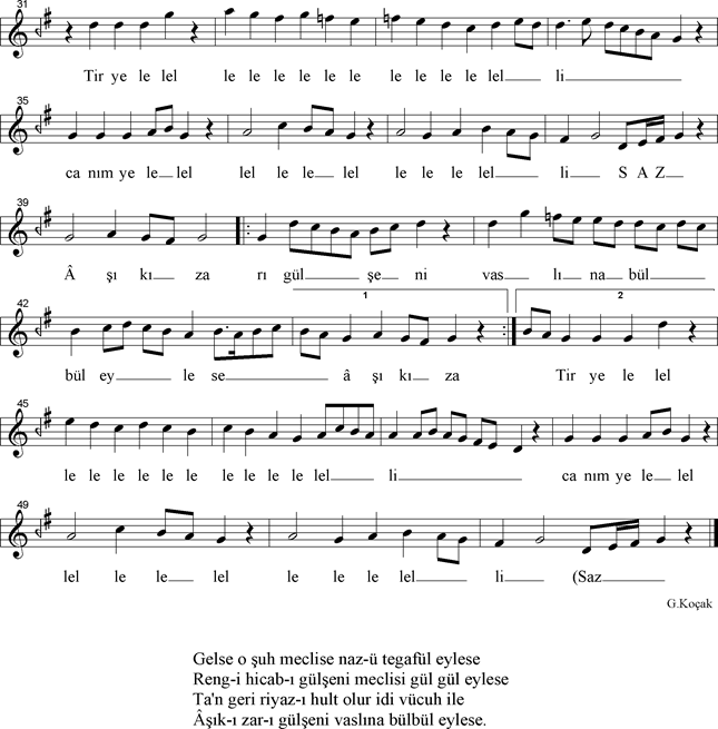 | Aksak (9/8) Kara Bulutları Kaldır Aradan Ay Doğdu Batmadı Mı Tel Tel Taradım Penceremin Perdesi Kara Gözlüm Efkarlanma Çadırımın Üstüne Bülbülüm Altın Kafes Aşkınla Yana Yana Gözlerin Sefalar Getirdiniz | 1 2 3 4 5 6 7 8 9 Düüm Te Ke Düüm Teek Tek *Düm Te Ke Düüm Teek Tek *Düm Te Ke /3 Düm Tek Te Ke |