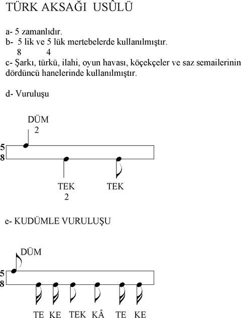 | Türk Aksağı (5/8) Divane Aşık Vardar Ovası Iğdırın Al Alması Barış Manço – Geçti Dost Kervanı | 1 2 3 4 5 Düüm Teek Tek *Düm Te Ka Düüm Tek Teeek *Düm Te Ke Düm Tek Te Ke *Düm Te Ke Tek Düm Te Ke *Düme Düm Tek Te *Düme Düm Tek Ka *Düme Düm Tek Te Ke *Düm Te Ke Tek Ka Te Ke |