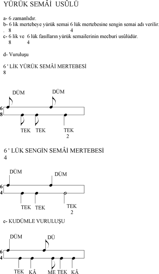 | Yörük Semai (6/4) Sengin Semai (6/2) Gül Yüzlerin Şevkine Gel Sen Sanki Baharın Gülüsün Böyledir Bizim Sevdamız | 1 2 3 4 5 6 Düm Tek Tek Düm Teek *Düm Tek Tek Düme Tek Te Ke *Düm Tek Ka Düme Tek Ka *Düm Tek Tek Düme Tek Ka |